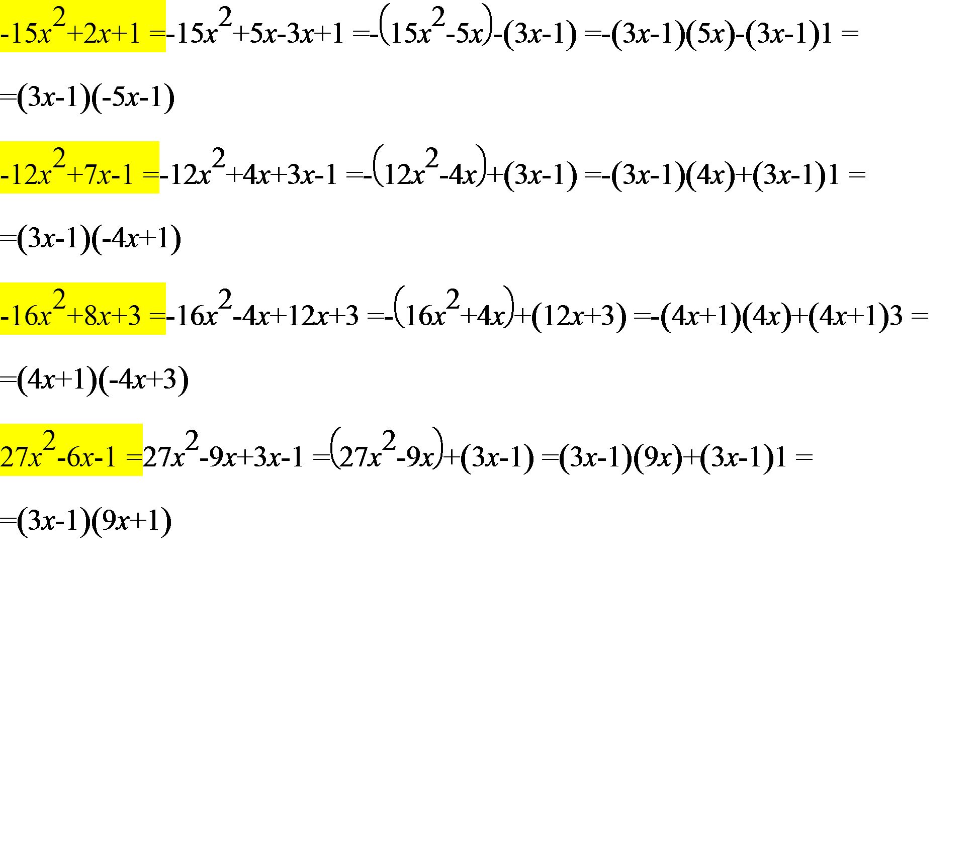разложите на множители квадратный трёхчлен: 1)-15x2+ 2x+1=; 2)-12x2+7x-1;3)-16x2+8x+3;4) 27x2-6x-1