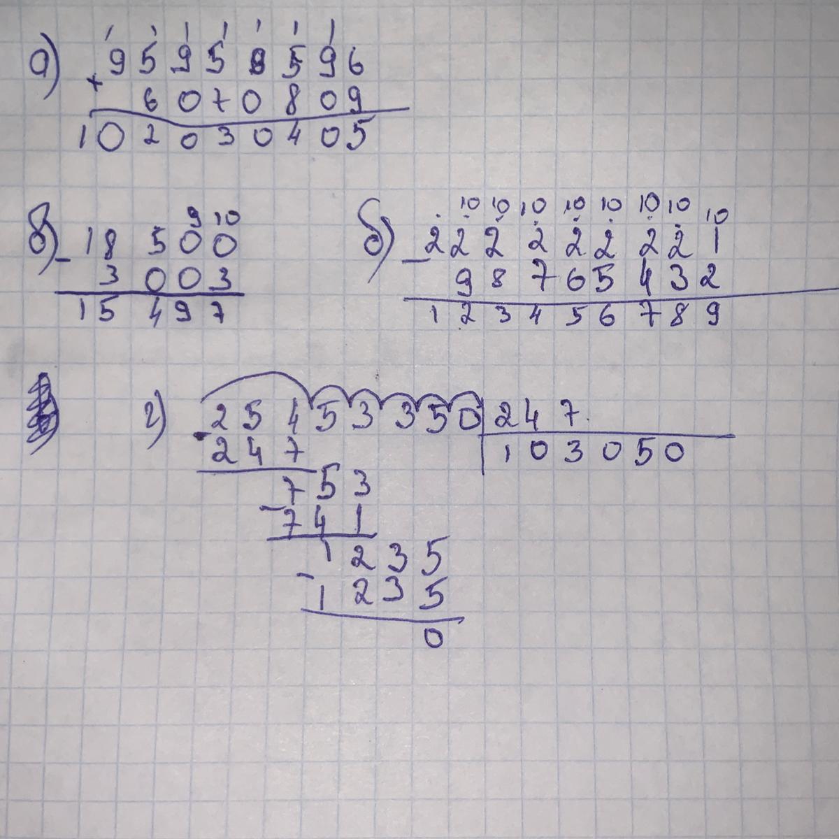 б) 222 222 221 — 98 765 432; г) 25 453 350 : 247.