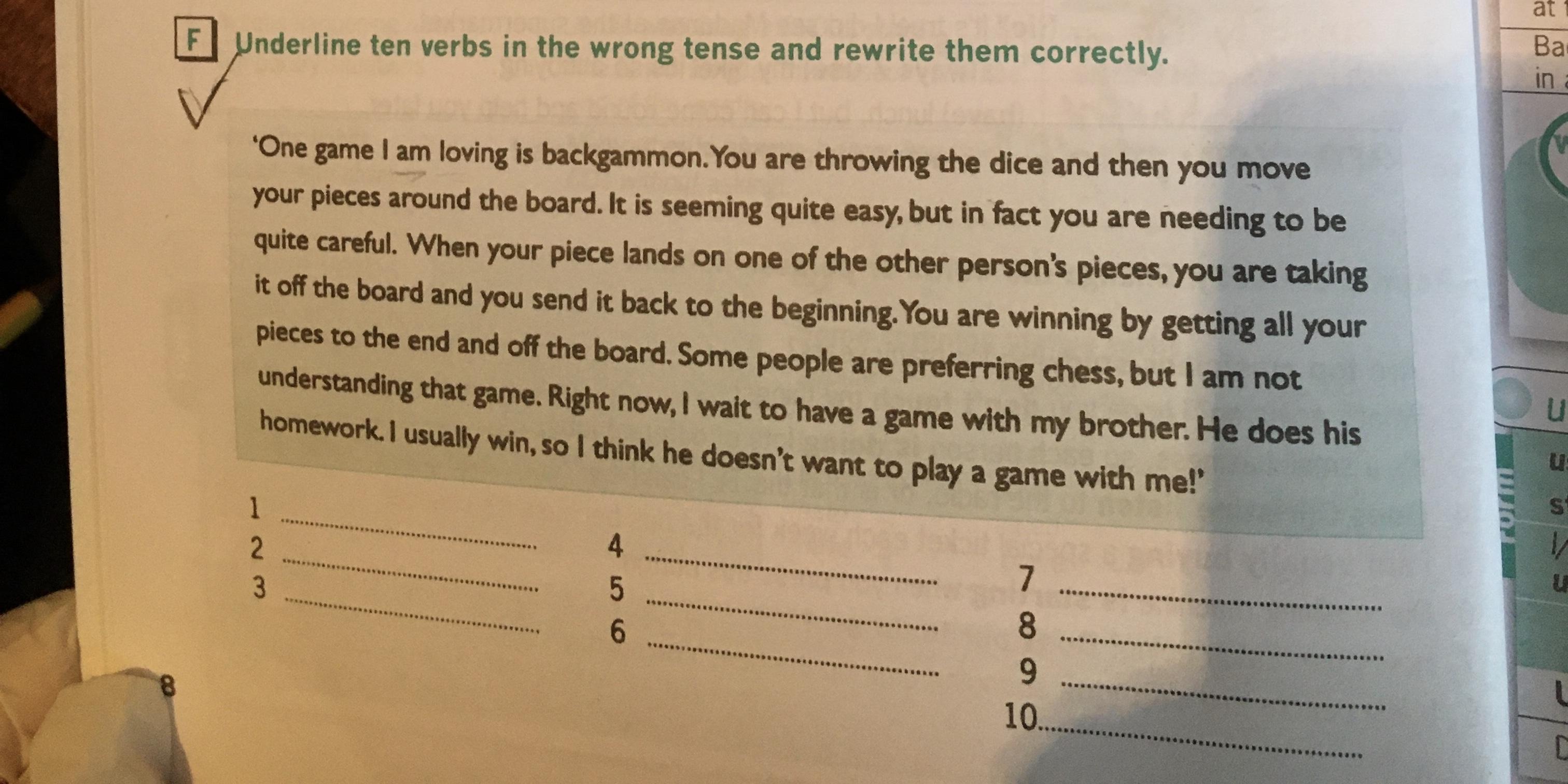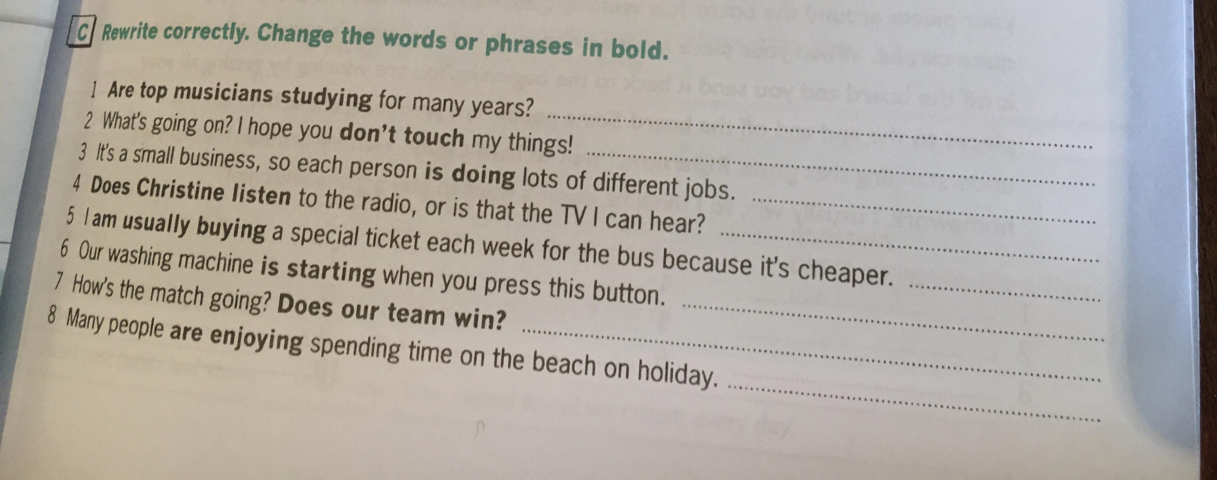 1. Do top musicians study 2. aren't touching 3. does 4. Is Christine listening 5. I usually buy 6. starts 7. Is our team winning? 8. enjoy
