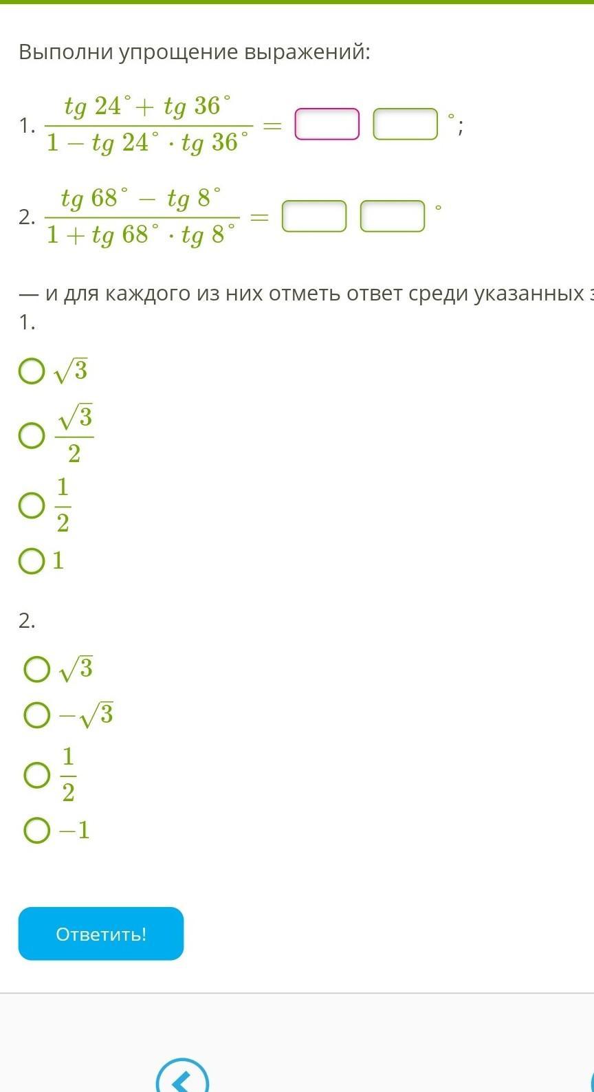 2)это формула тангенса разности tg(68-8)=tg60=Корень из 3 (первый ответ)