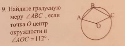 AOC опирается на малую дугу AC, равную 112 градусов, поскольку угол AOC - центральный. Значит, большая дуга АС равна 360-112=248 градусов. Угол АВС - вписанный, значит, он равен 248/2=124.