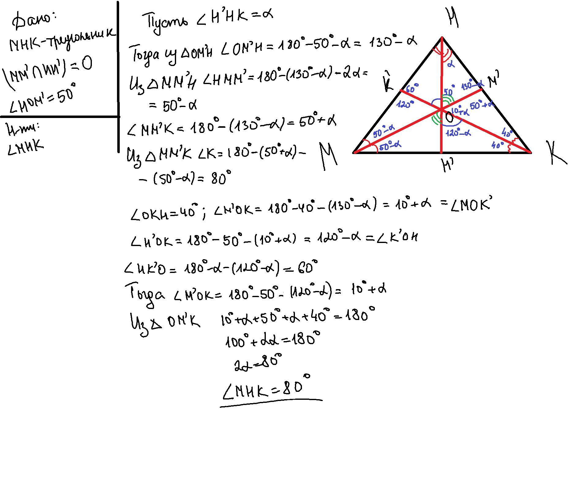 Дан треугольник МНК, биссектрисы углов М и Н пересекаются под углом 50 градусов. Найдите угол МНК