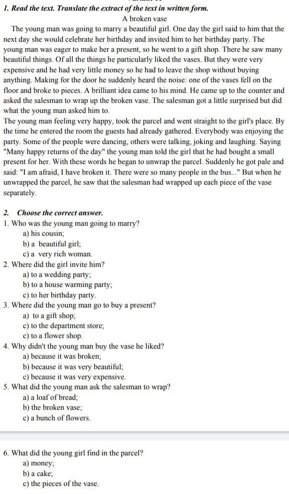 Один молодой человек собирался жениться на красивой девушке. Однажды девушка сказала ему, что на следующий день она будет отмечать свой день рождения и пригласил его к себе на день рождения. Молодой человек был готов сделать ей подарок, поэтому он отправился в сувенирный магазин. Там он увидел много красивых вещей. Из всех вещей, которые он особенно понравился вазы. Но они были очень дорогими, и, как он было очень мало денег, он был вынужден покинуть магазин без покупать что-либо. Создание к двери, он вдруг услышал шум: один из вазы упал на пол и разбилась. Блестящая идея пришла ему в голову. Он подошел счетчик и спросил продавца, завернуть разбитую вазу. Продавец получил немного удивлен, но сделал то, что молодой человек попросил его.