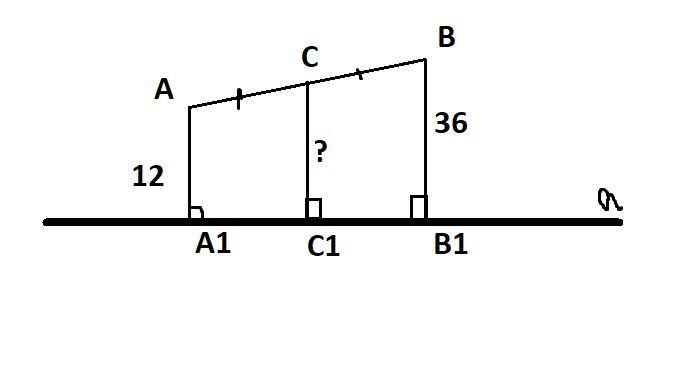 по одну сторону от прямой заданы точки А и В. найдите расстояние от середины отрезка АВ до этой прямой, если данные точки удаленны от этой прямой на 12 см и 36 см