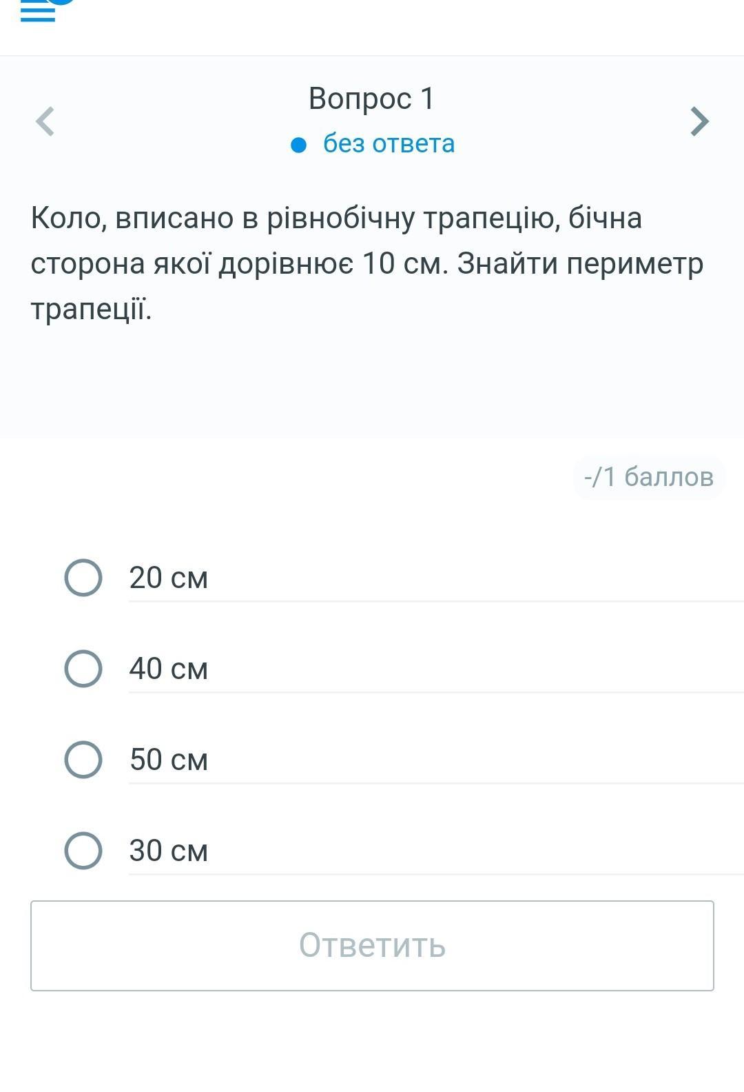 Коло, вписано в рівнобічну трапецію, бічна сторона якої дорівнює 10 см. Знайти периметр трапеції