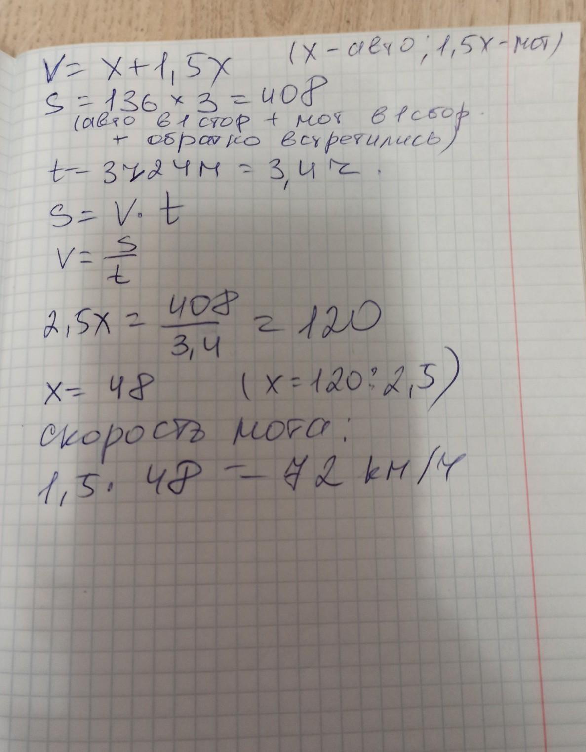 из пункта А в пункт В выехал автомобиль.В это же время из пункта В в пункт А выехал мотоциклист скорость которого в 1,5 раз больше скорости автомобиля.Встретившись они продолжили движение.Доехав до пункта В автомобиль немедленно повернул назад./Доехав до пункта А мотоциклист немедленно повернул назад.Их вторая встреча через 3 часа 24 минут после отправления. С какой скоростью ехал мотоциклист если рас
