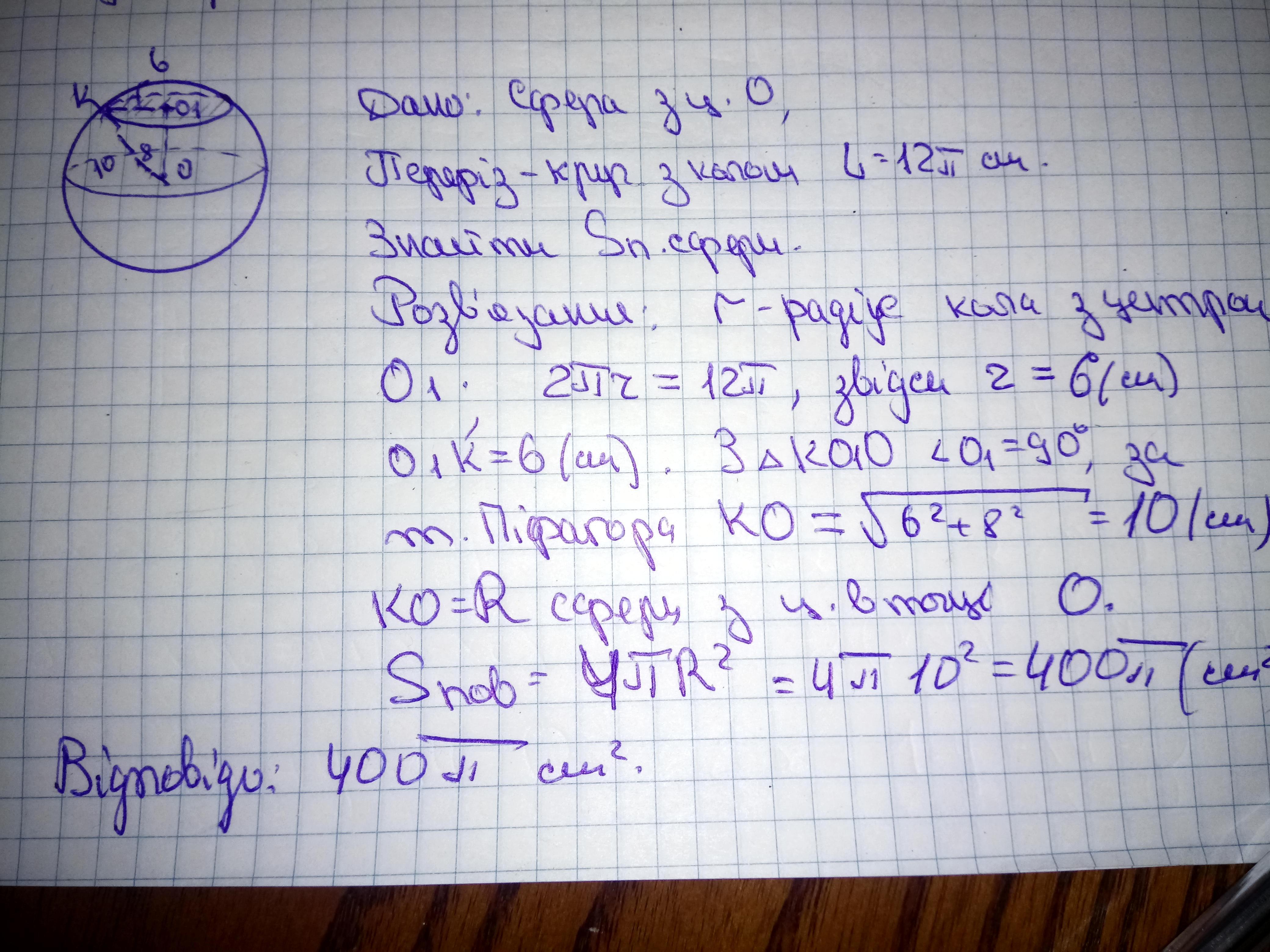 Лінія перетину сфери і площини, віддаленої від центра сфери на 8 см, має довжину 12π см.
