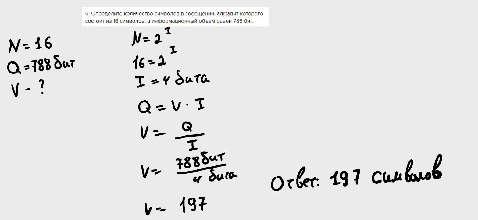 6. Определите количество символов в сообщении, алфавит которого состоит из 16 символов, а информационный объем равен 788 бит.