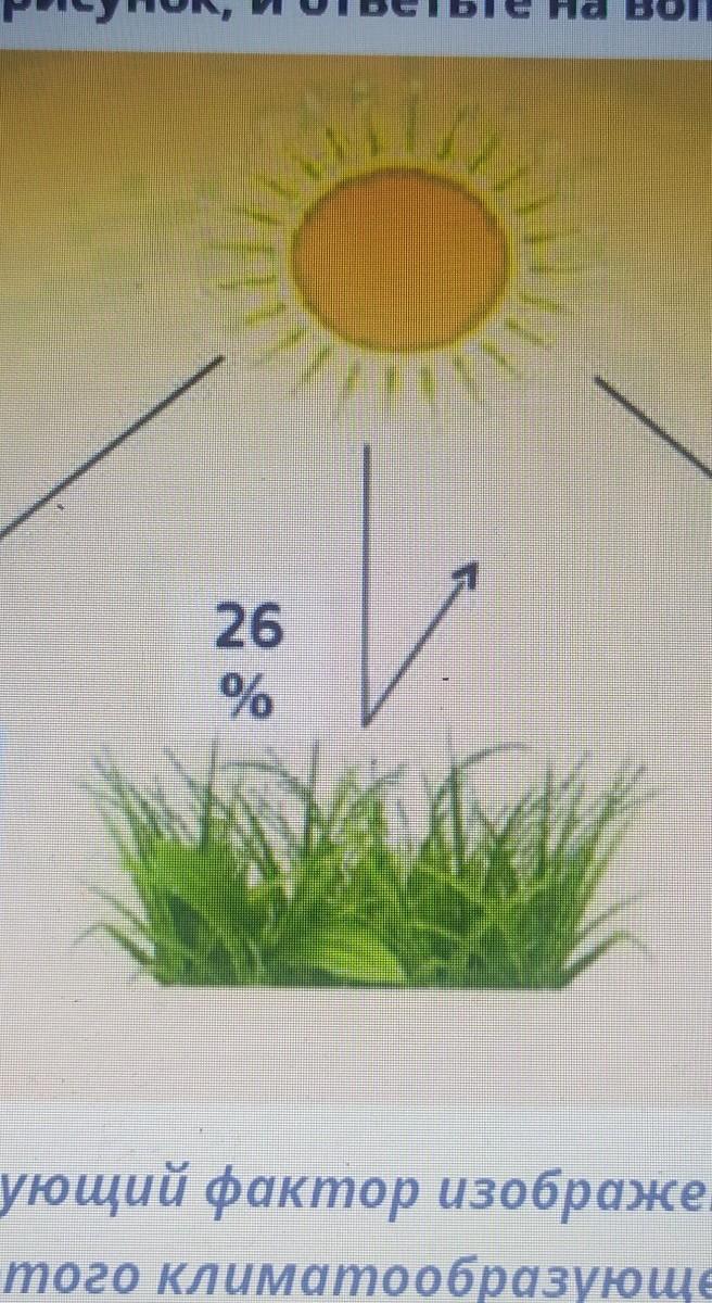 Климат зависит от того, какое количество солнечной радиации поглощается земной поверхностью, а какое отражается.На рисунке показано альбедо луга, которое составляет 26 %.То есть 26 % это отражённая радиация.Чем светлее и глаже поверхность, тем больше будет отражённой солнечной радиации.