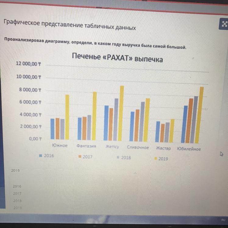 Проанализировав диаграмму определи в каком году выручка была самый большой в 2016 в 2017 в 2018 в 2019