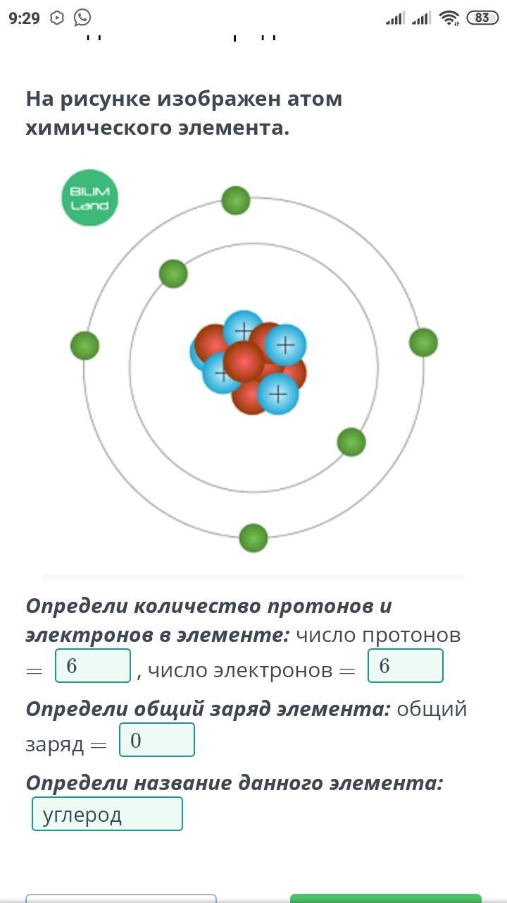 Закон сохранения электрического заряда, взаимодействие неподвижных зарядов. На рисунке изображен атом химического элемента. Определи количество протонов и электронов в элементе: число протонов = , число электронов = Определи общий заряд элемента: общий заряд = Определи название данного элемента:
