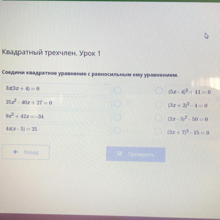 Соедини квадратное уравнение с равносильным ему уравнением.