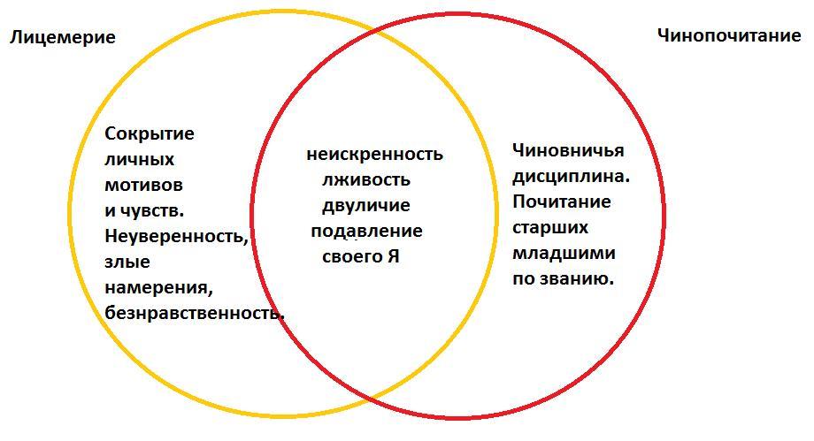 Составьте диаграмму Венна, раскрывая смысл понятий “лицемерие”, “чинопочитание”. Сравните два понятия, выявите общие черты и различия.