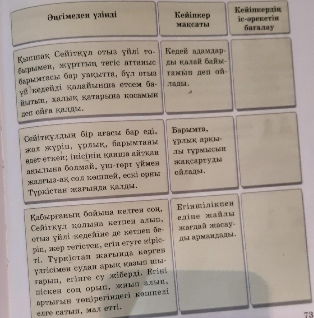 3)мен Сейітқұлдың іс әрекетін көріп еңбекқор екенін байқадым. Себебі, ол кедейлермен бірге егін егіп, піскен соң жинап алып, артығын елге сатып, мал етті.