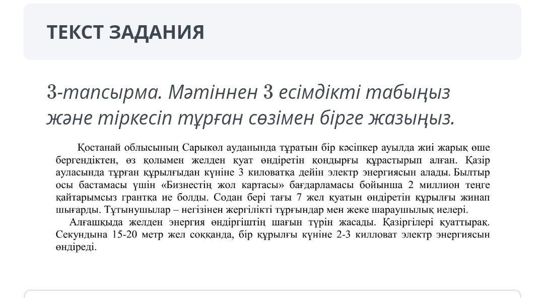3-тапсырма. Мәтіннен 3 есімдікті табыңыз және тіркесіп тұрған сөзімен бірге жазыңыз.