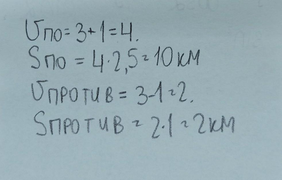 Собственная скорость лодки 3 км/ч, скорость течения 1 км/ч. Найдите расстояние, которое пройдет лодка за 2,5 часа по течению и за 1 часа против течения