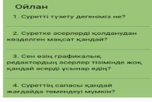 1) суретті түзету дегініміз оның бір жерін дұрыстап қою немесе оны бастан аяққа дейің қайтып салу. 2) суретке əсерлерді қосқанда адам суретті əдемі жарық ету мақсатында пайдаланады. 3) Фильтр, əдемі стикерлер қосуды ұсынар едім. 4) суреттің сапасы əдемілігіне қарай жəне түс мөлшері жəне жақсы салынбаған кезде сапасы түсіп кетуі мүмкің деп ойлаймын.
