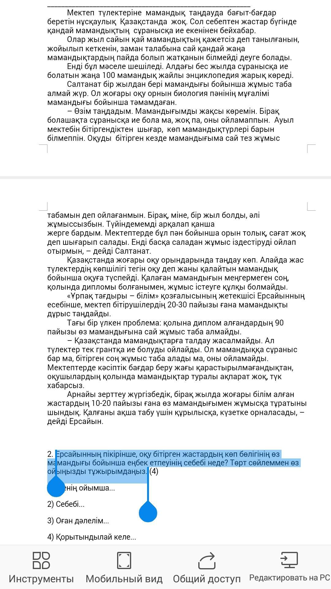 Ерсайынның пікірінше, оқу бітірген жастардың көп бөлігінің өз мамандығы бойынша еңбек етпеуінің себебі неде? Төрт сөйлеммен өз ойыңызды тұжырымдаңыз