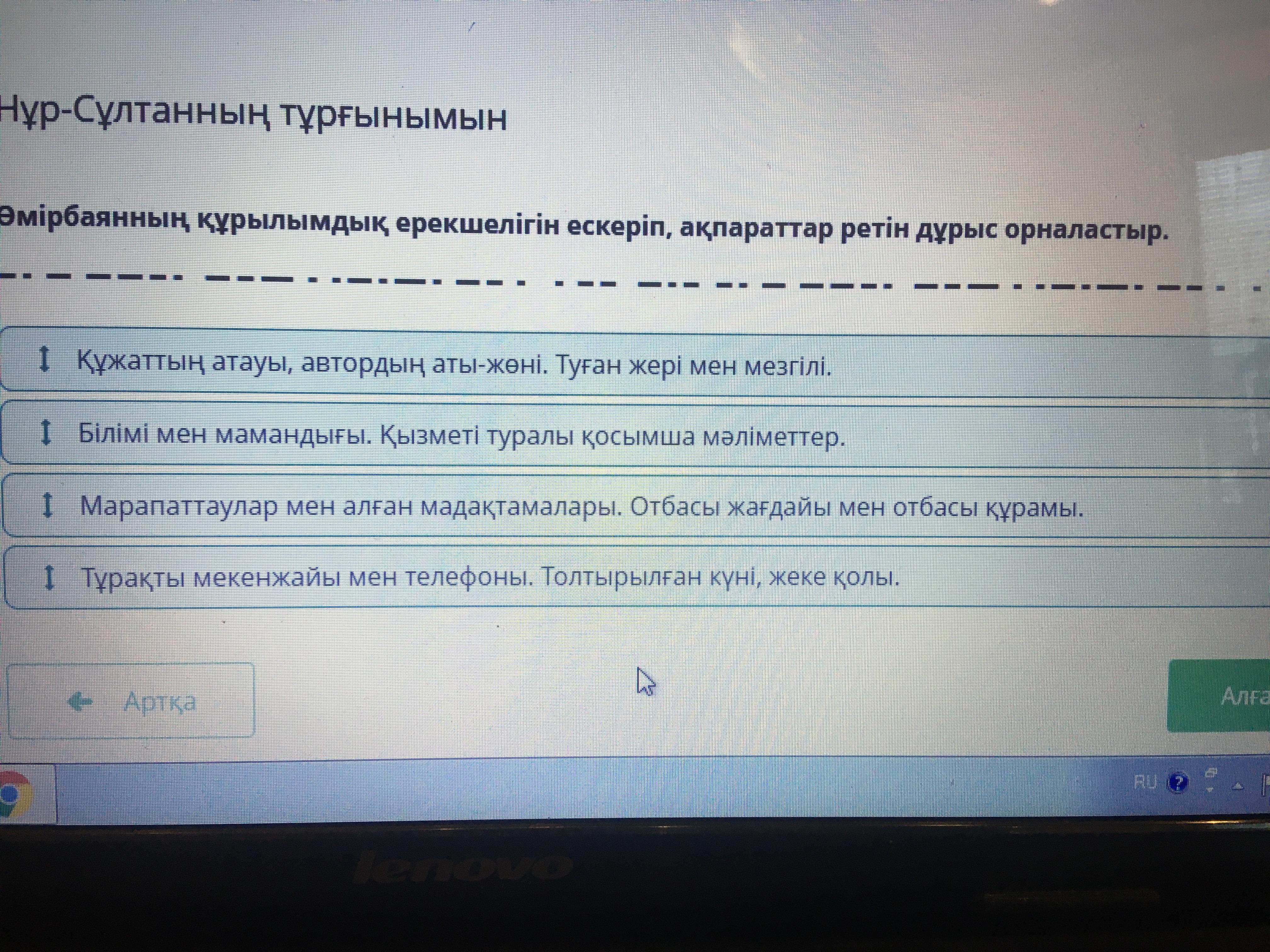 Нұр-Сұлтанның тұрғынымын Өмірбаянның құрылымдық ерекшелігін ескеріп, ақпараттар ретін дұрыс орналастыр. 6393745 Тұрақты мекенжайы мен телефоны. Толтырылған күні, жеке қолы. Марапаттаулар мен алған мадақтамалары. Отбасы жағдайы мен отбасы құрамы. Құжаттың атауы, автордың аты-жөні. Туған жері мен мезгілі. Білімі мен мамандығы. Қызметі туралы қосымша мәліметтер.