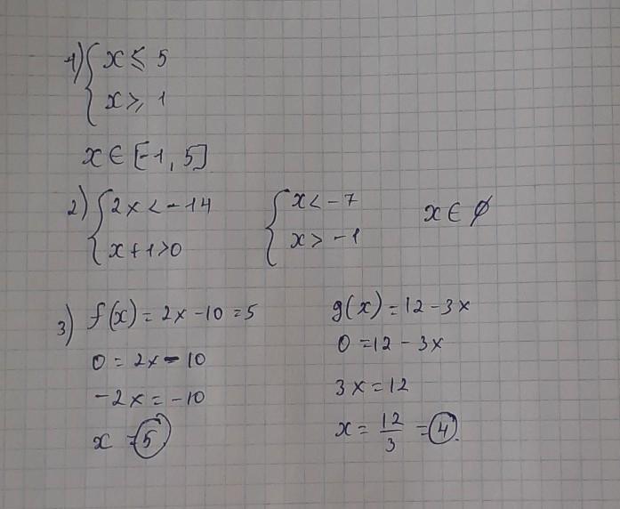 x∈[-1; 5] - пересечение решений (двойная штриховка) от х= -1 до х=5, это решение системы неравенств. Скобки квадратные.