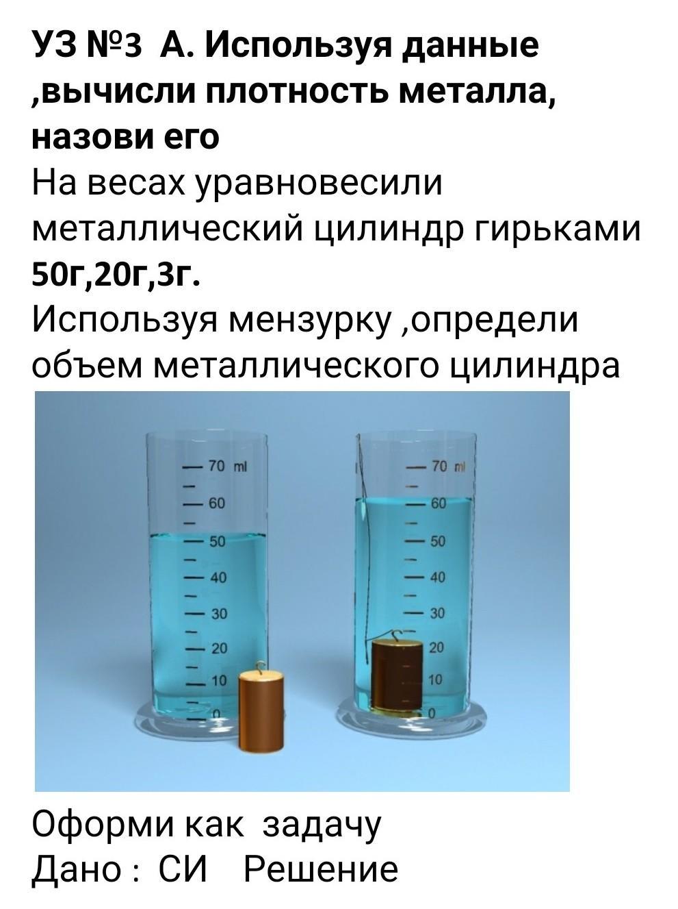 На весах уравновесили металлический цилиндр гирьками 50г,20г,3г.