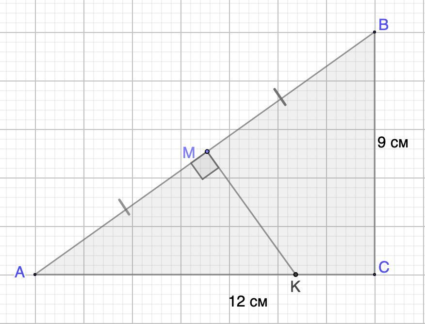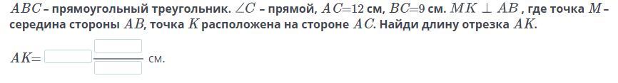 , где точка M – середина стороны AB, точка K расположена на стороне AC. Найди длину отрезка AK.