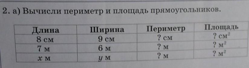 длина - х м; Ширина у м; периметр (2х+2у) м; площадь ху м²