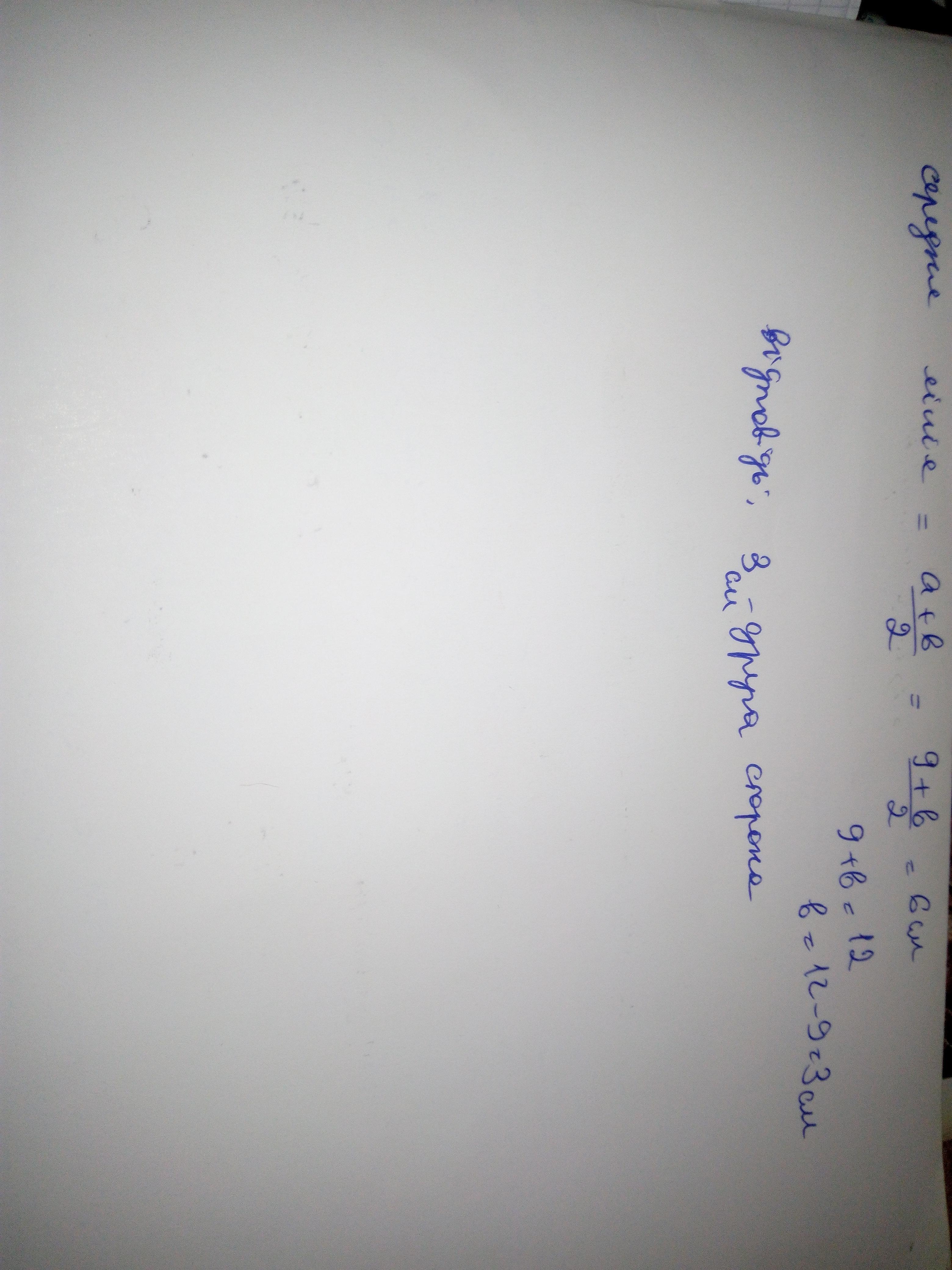 Знайди основу трапеції, якщо одна з її основ та середня лінія трапеції дорівнюють відповідно 9 см і 6 см