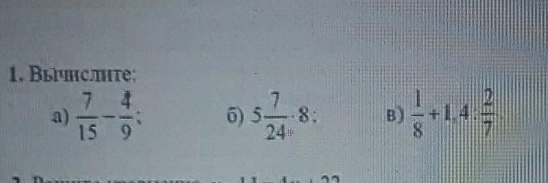в) 1/8 + 1,4 : 2/7 = 1/8 + 7/5 · 7/2 = 1/8 + 49/10 = 0,125 + 4,9 = 5,025.