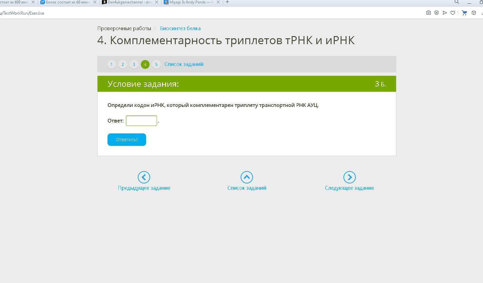 Триплету тРНК АУЦ комплементарен кодон иРНК УАГ.