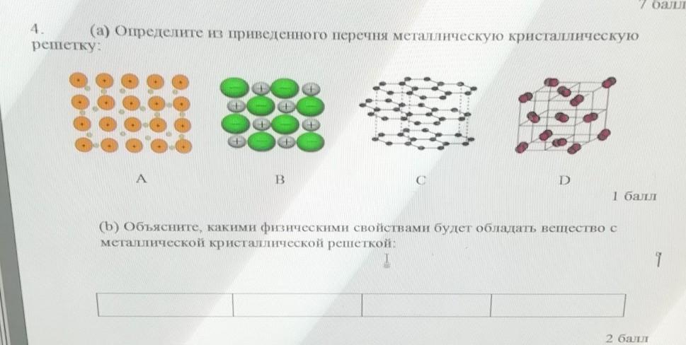 Металлическая решетка это там, где есть решетка, по узлам ионы, а внутри электроны "плавают". Я не вижу, но вроде бы D. Свойства:ковкость, пластичность, металлический блеск, твёрдость, тепло и электро проводность. В общем, все свойства металлов.