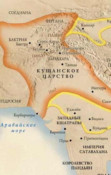 А Кушанское на огромной территории Средней Азии. Границы империи простирались от северной части современной Индии, Пакистана, Афганистана и Китая до Европы
