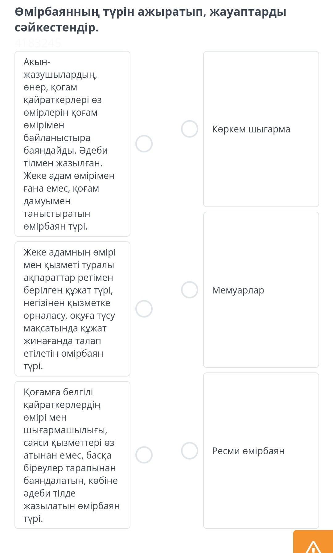 Өмірбаянның түрін ажыратып, жауаптарды сәйкестендір.