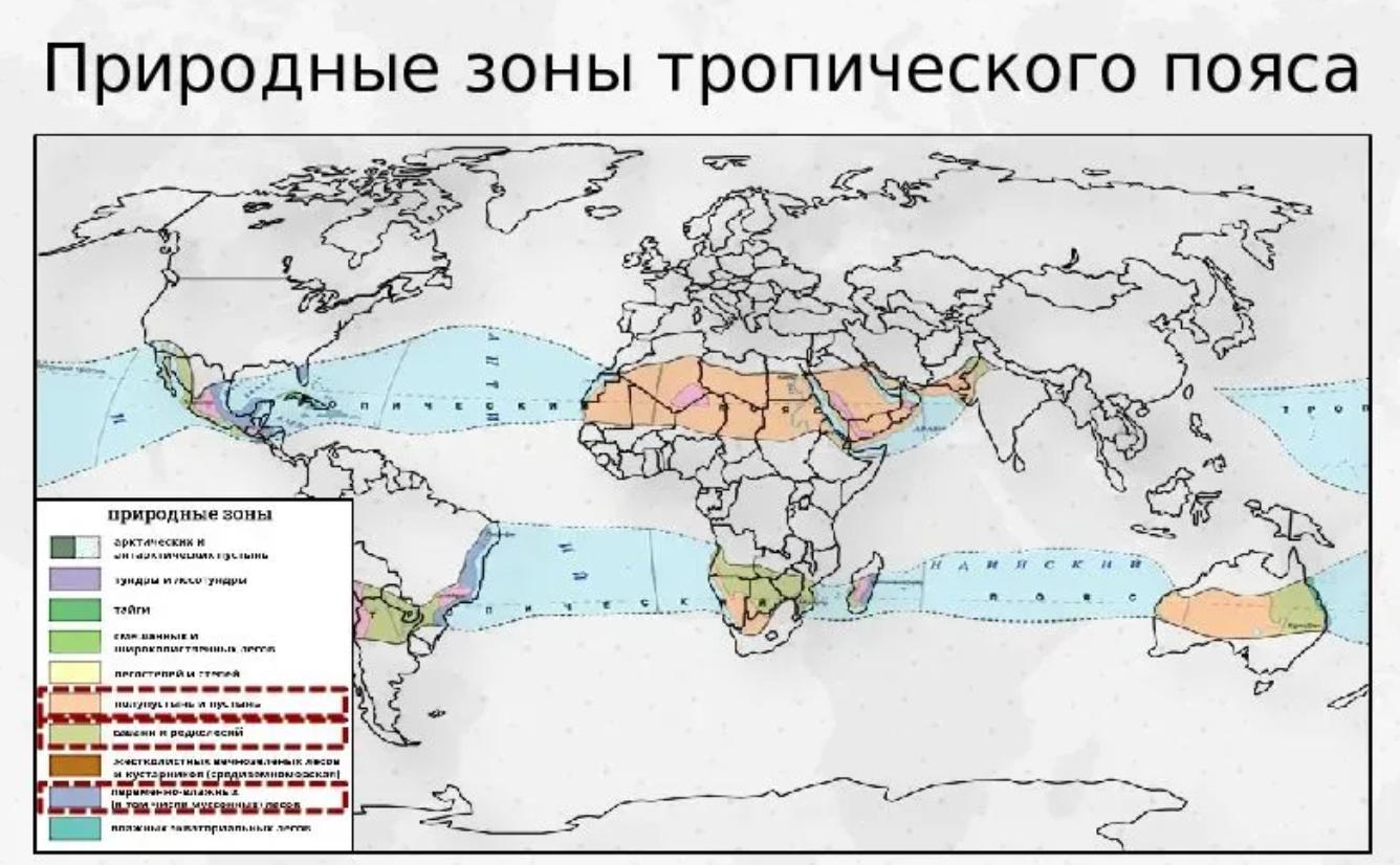 Природные районы тропических поясов представляют собой тропические влажные лесы, саванны, пустыни, полупустыни.
