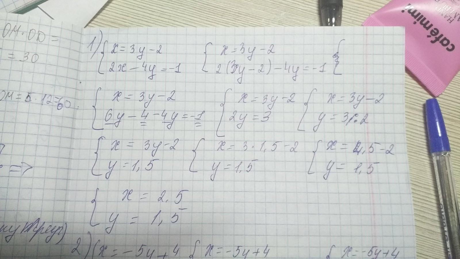 1) 2(3y-2)-4Y=-1 6Y-4-4Y =-1 2Y=3 Y=3/2 X=3*3/2-2 X=9/2-2 X =4.5-2 X=2.5