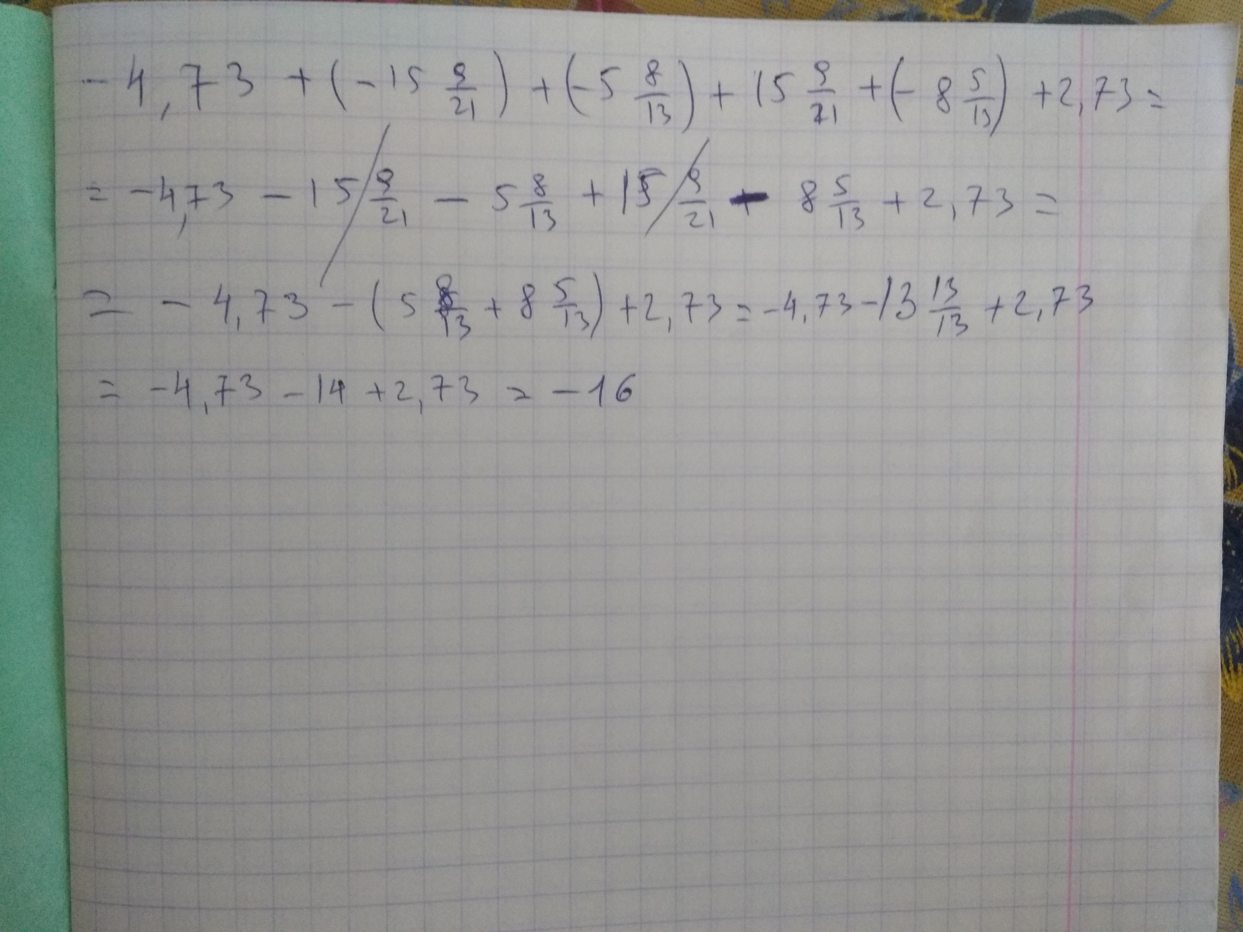 -4,73 + (-15 9/21) + (-5 8/13)+15 9/21+ (-8 5/13) - 2,73 (4)
