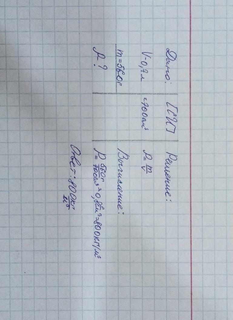 Спирт объёмом 0,7л имеет массу 560г. Найдите плотность спирта. Выразите ее в килограммах на кубический метр (кг/м³)
