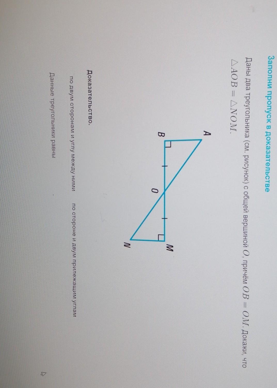 Даны два треугольника (см. рисунок) с общей вершиной 0, причем OB = OM , Докажи, что