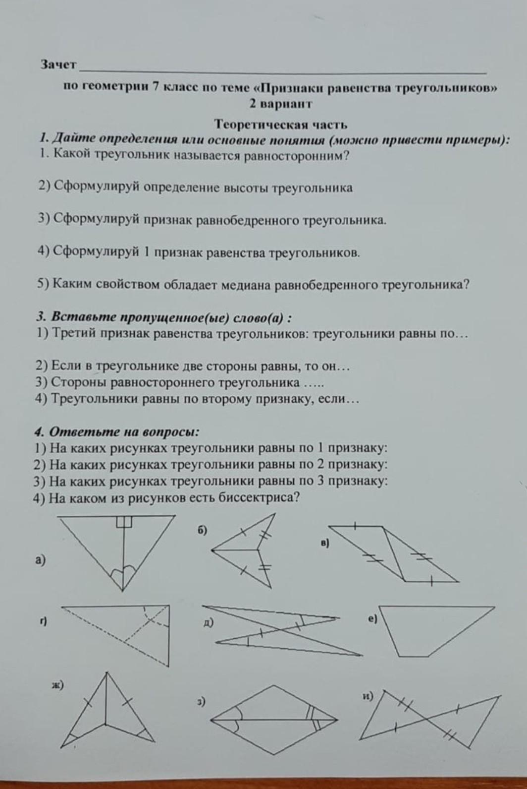 4) дваприлегающих угла и сторона одного треугольника соответственно равны стороне и двум прилежащим к ней углам другого треугольника