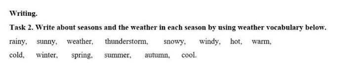 Write about seasons and the weather in each season by using weather vocabulary below пжжжж умоляю у меня бжб