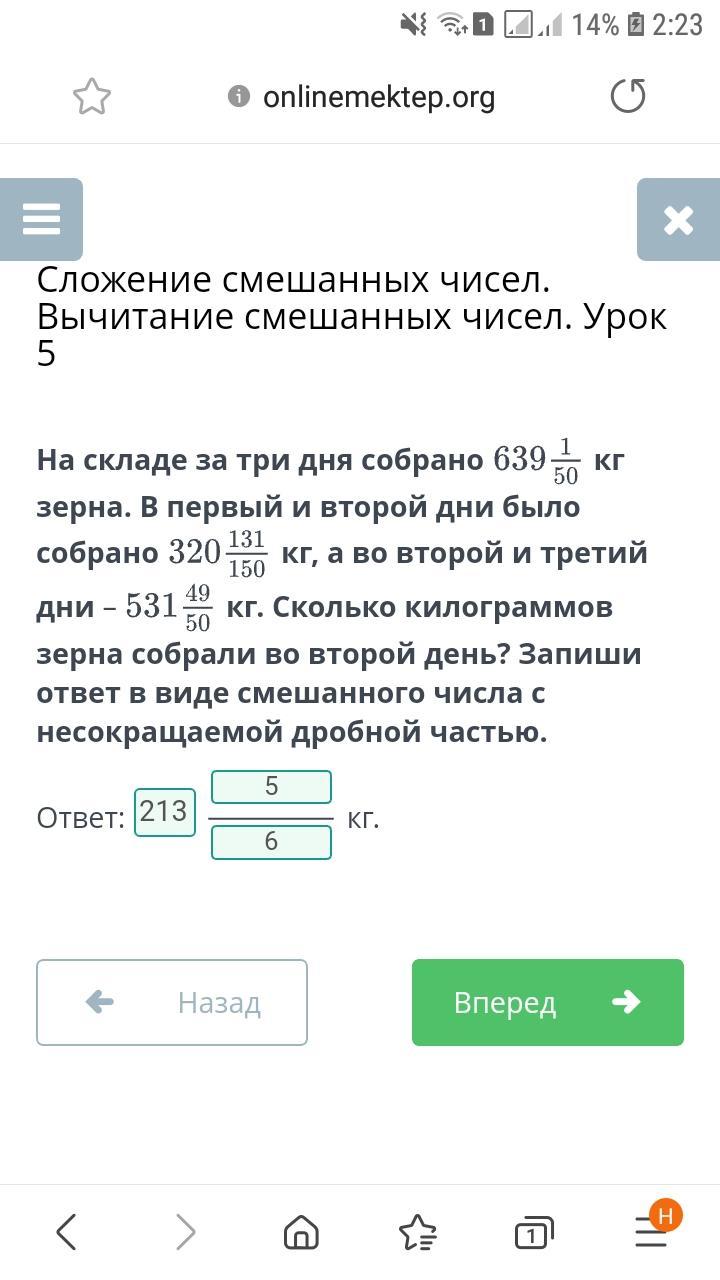 кг. Сколько килограммов зерна собрали во второй день? Запиши ответ в виде смешанного числа с несокращаемой дробной частью.