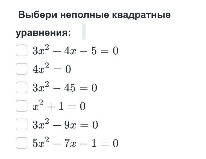 Вот не полные квадратные уравнения:4х^2=0; 3х^2-45=0; х^2+1=0; 3х^2+9х=0