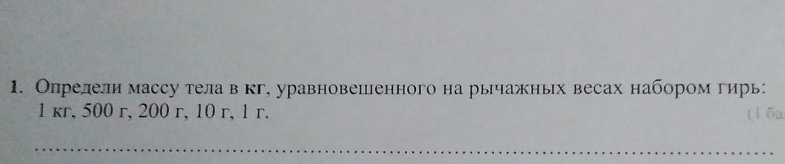 1. Определи массу тела в кг, уравновешенного на рычажных весах набором гирь: