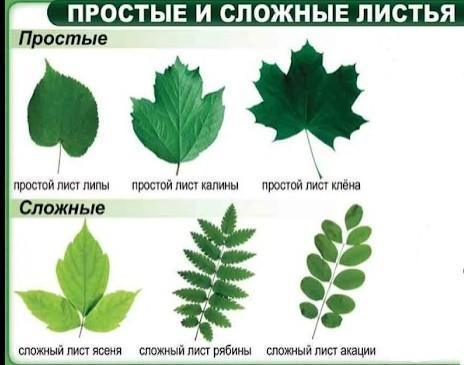 На черешке каждого простого листа только одна листовая пластинка. А сложные листья имеют несколько расположенных на одном черешке листовых пластинок, которые именуют листочками. Среди простых листьев различают цельные, лопастные, раздельные и рассеченные.