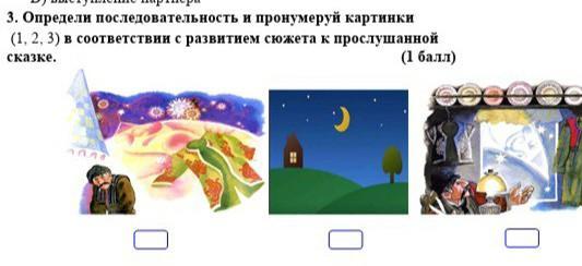 3. Определи последовательность и пронумеруй картинки ( 1 , 2 , 3 ) в соответствии с развитием сюжета к прослушанной сказке . ( 1 балл ) 0