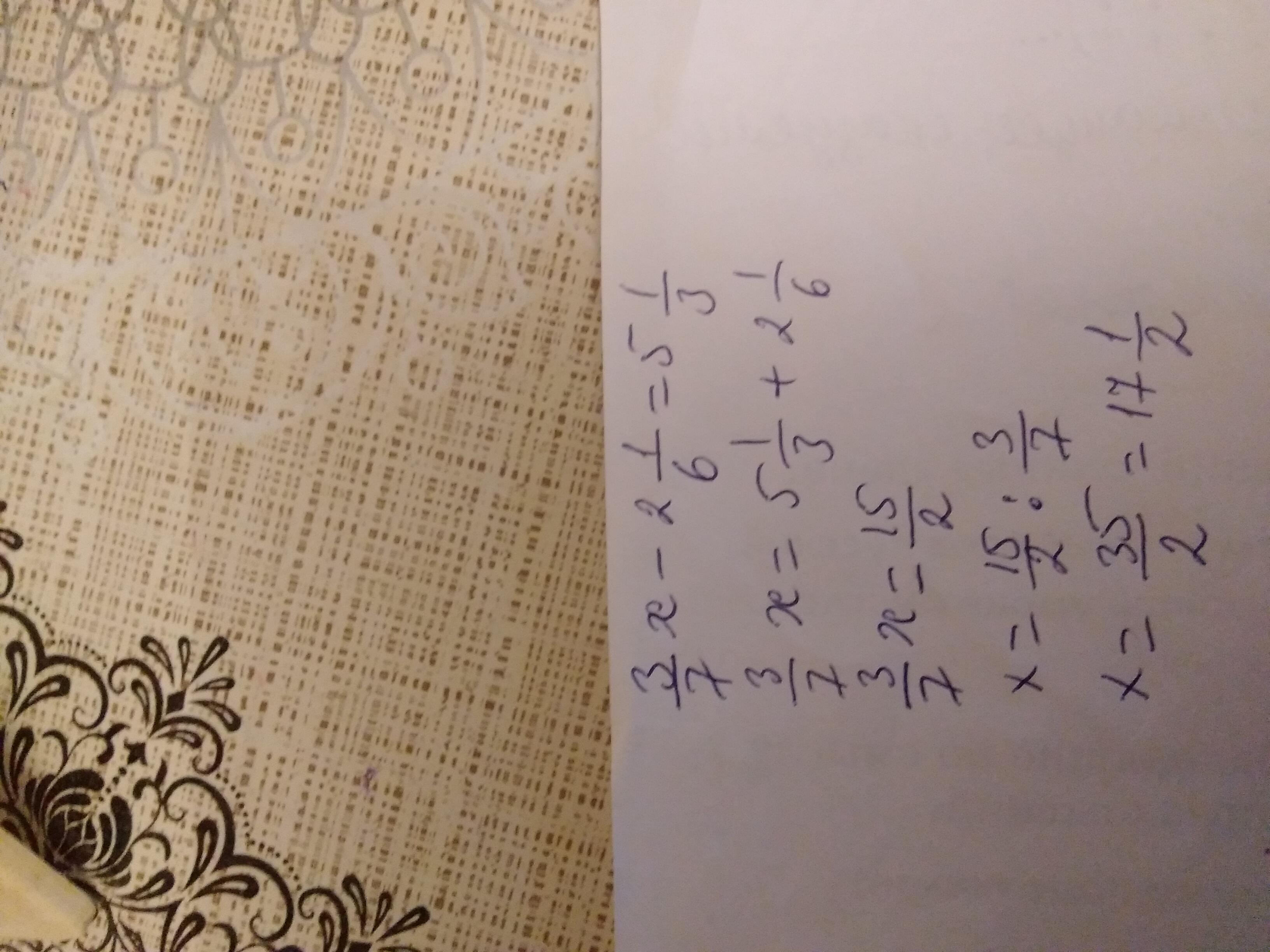 Проверка: 3/7 · 35/2 - 2 1/6 = 15/2 - 2 1/6 = 7 3/6 - 2 1/6 = 5 2/6 = 5 1/3