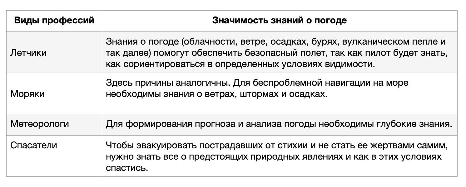 представители каких профессий необходимы знания о погоде и как эти зоны знания помогают в профессиональной деятельности