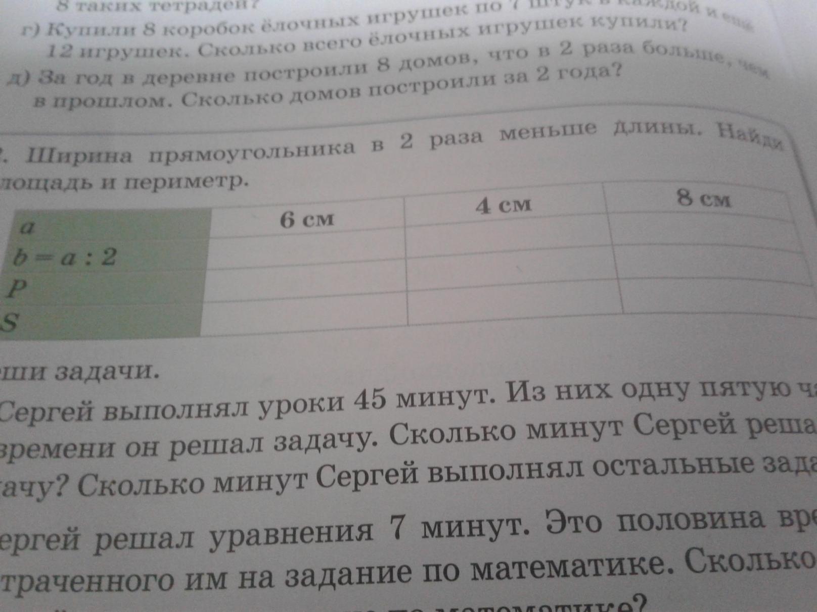 Ширина прямоугольника в два раза меньше длины. Найди площадь и периметр.