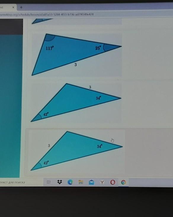 Согласно второму признаку равенства треугольников, укажи треугольник, равный данному.