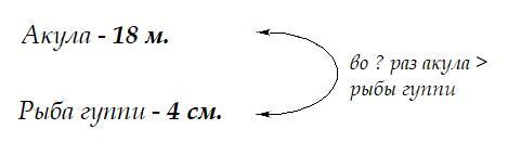 1) 1800 : 4 = в 450 раз акула длиннее, чем рыба гуппи.